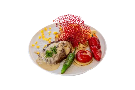 <b>İçindekiler:</b> lzgarada özenle pişirilmiş dana bonfile, kırmızı şarapla hazırlanmış aromatik mantar sosu eşliğinde servis edilir.